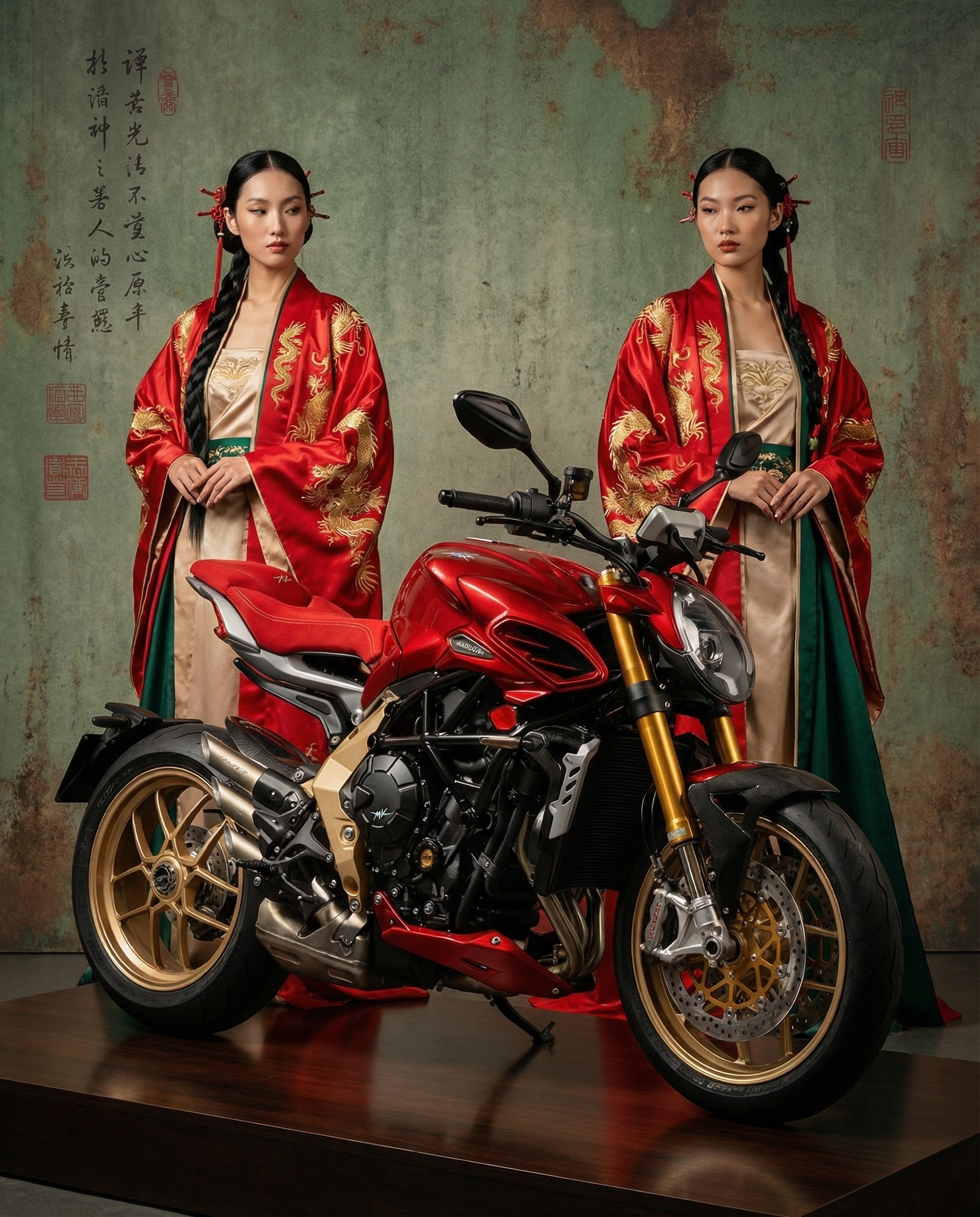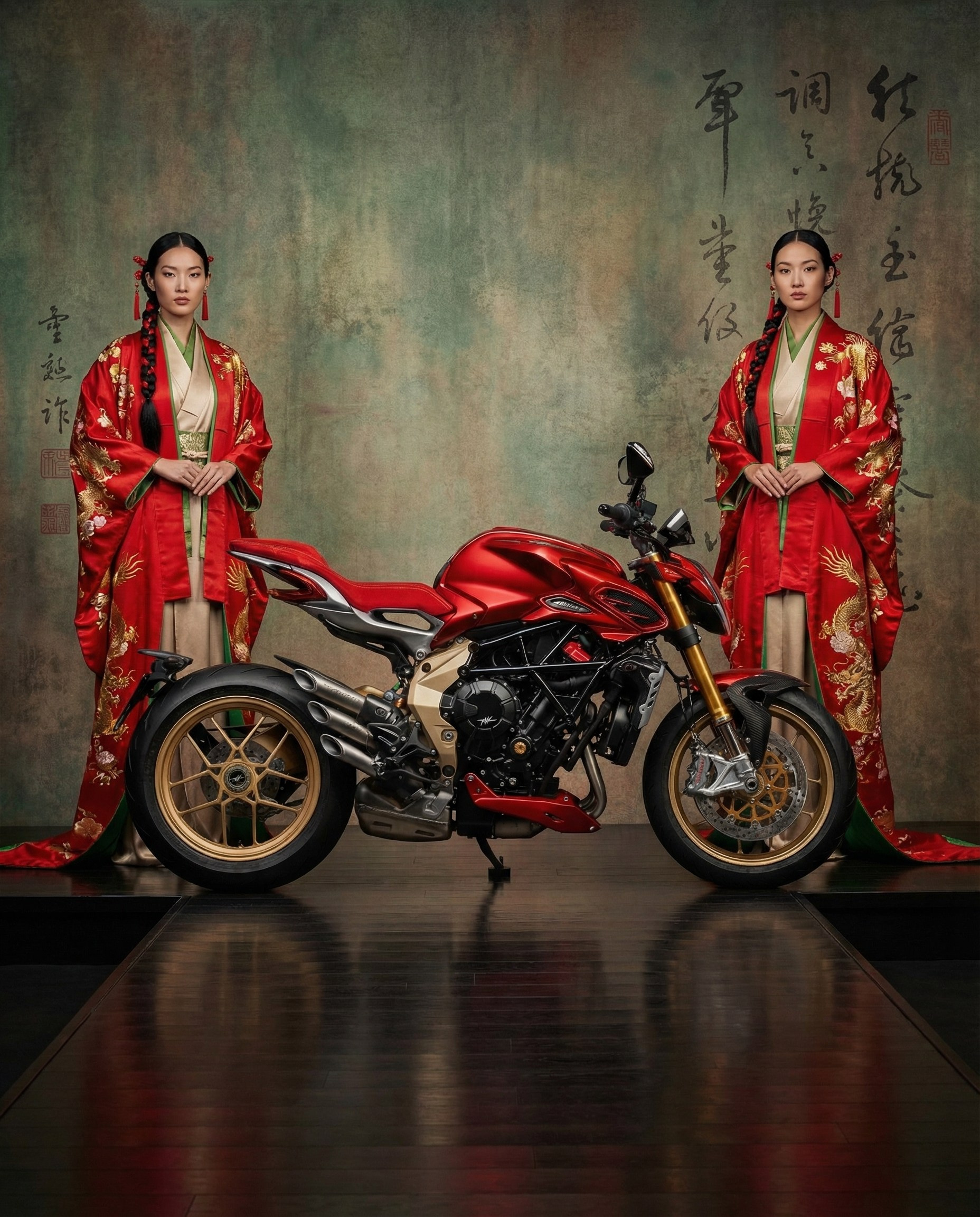 Две модели в красных традиционных накидках по бокам мотоцикла, каллиграфический фон